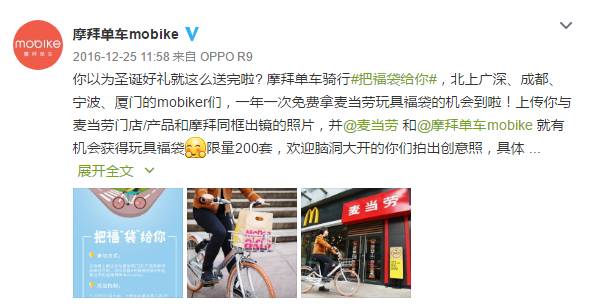 对于品牌来说,节日是不可错过的借势营销机会。摩拜单车就曾在感恩节携手“本来生活”给mobiker们送褚橙;在情人节发起表白路线活动,鼓励人们骑出心形、“I LOVE U”等形状;在万圣节举办骑行大趴体、“摩拜罩你”等活动。