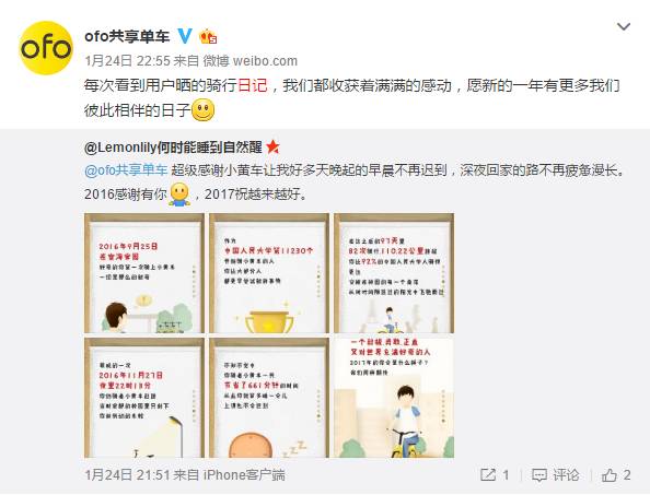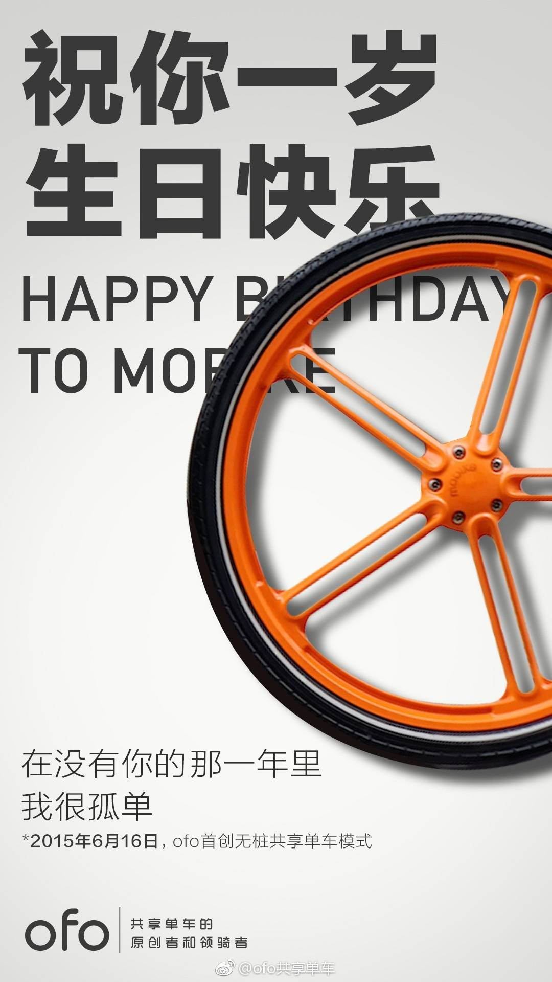 表面上祝摩拜一周岁生日快乐,但表达的深层次重点却在于——自己在2015年6月16日就已经首创无桩共享单车模式。你摩拜一周岁,我ofo都快两年了!
