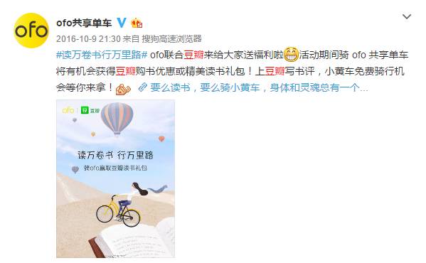 而今年2月27日,鹿晗新专辑《Venture》锋芒亮相,ofo也马上把用车页面添加上了鹿角,并在微博上发起“鹿晗敢冒险”话题。当天骑ofo共享单车的用户,只要在微博上发送行程图截屏,带上#鹿晗敢冒险#话题,并写下自己做过最冒险的一件事@ofo共享单车,就有机会获赠鹿晗签名专辑。