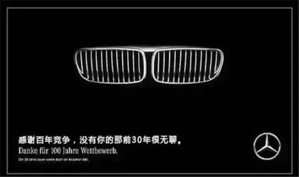 很多人都有印象的应该是宝马100周年纪念日时,来自对手奔驰的祝福海报:感谢100年来的竞争,没有你的那30年实在是太无聊了。