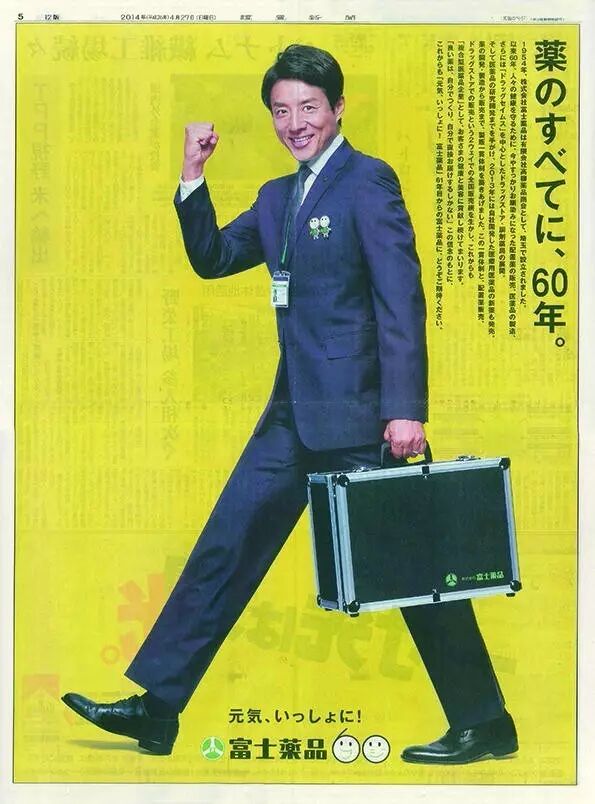 比较简单直接的如富士药品公司,在60周年庆广告上写了一句:“创设于1954年。60年来卖药、制药,更开了药店”,用短短一句话概况了60年的发展变迁。