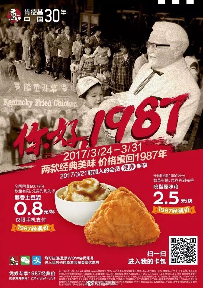 今年是肯德基进入中国30年,从上个月起,肯德基发起#我有炸鸡你有故事吗#和#价格重回1987年#等相关活动,引发了一次小范围的集体怀旧。
