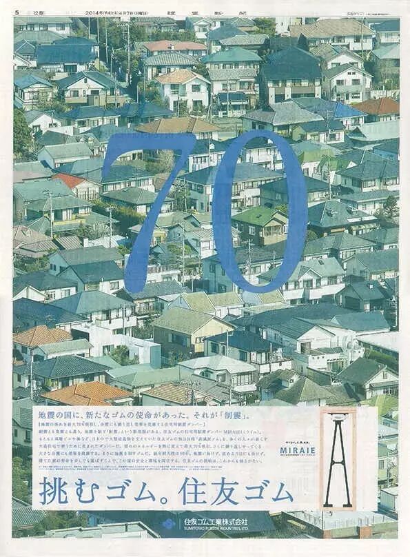 再比如住友橡胶公司70周年的广告标题:“在地震之国橡胶有新的使命,那就是‘制震’。”在70周年庆强调住友橡胶未来的挑战就是“今日起经得住摇晃”。