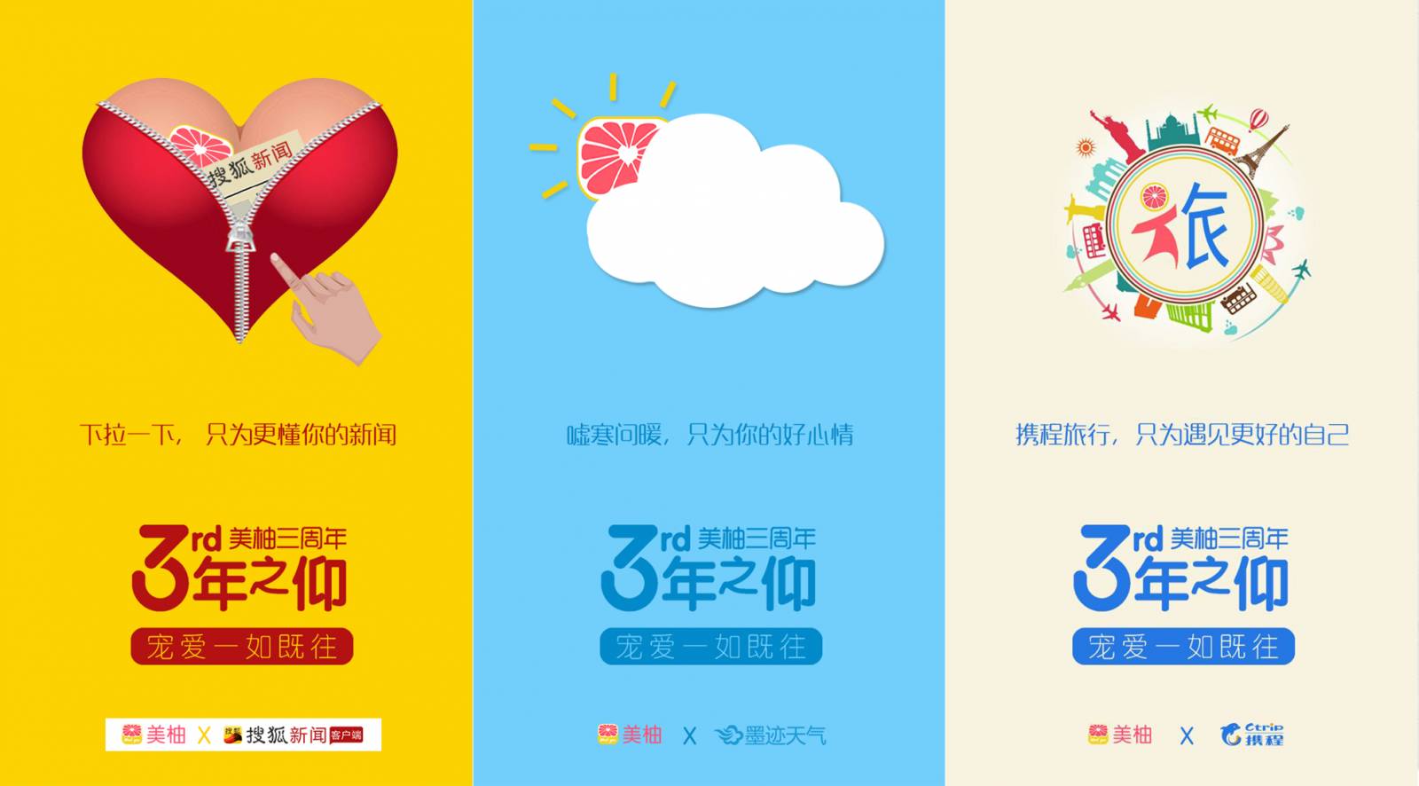 美柚三周年时联合数十家品牌发布庆生海报,美柚之后发布感谢微博互动,并用海报集合与品牌logo回礼。