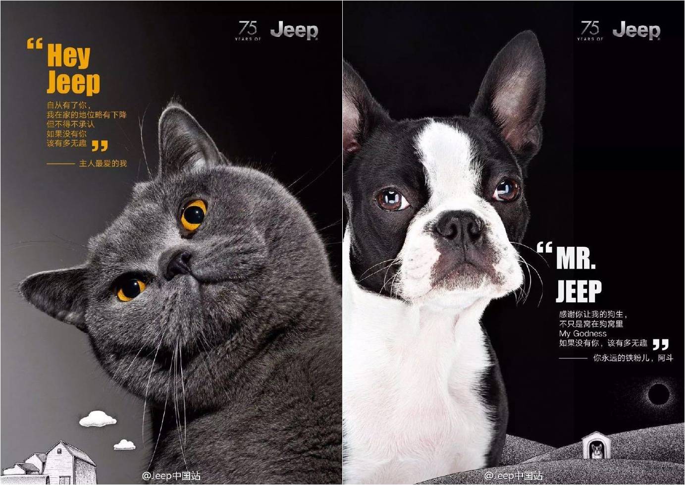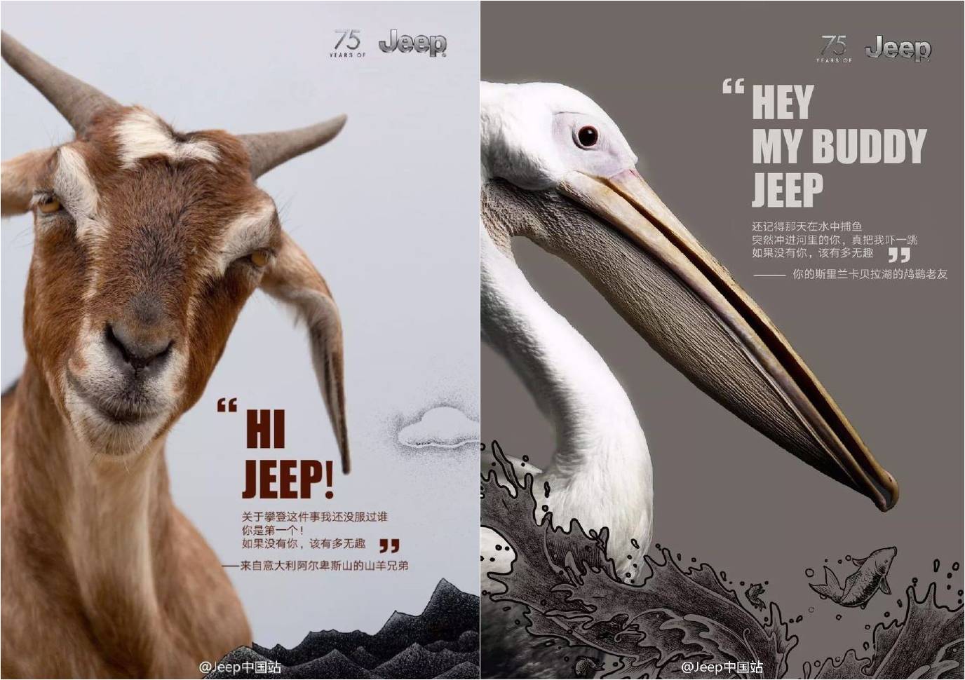 Jeep75周年时的创意海报也很有趣,角度是“世界各地的动物们发来贺电”,也制作了视频版,具体怎么回事,看看海报就知道了: