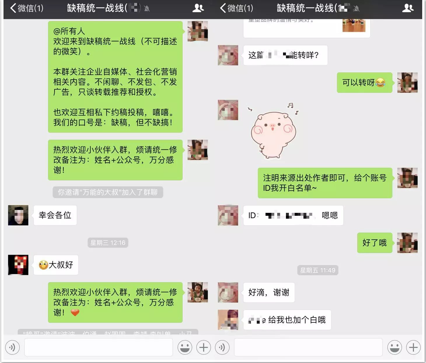 因此,如果你的账号有明确的细分领域,不妨化被动为主动,自己建立“缺稿群”,并将与自己领域相关的运营者拉入群中,以群主的身份自荐文章,内容更垂直,文章可用性更高。(相信社交媒体下人际关系网络的力量,也许能有行业KOL进群呢~)