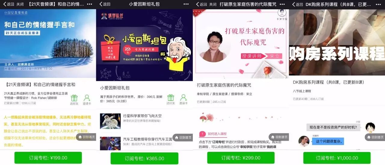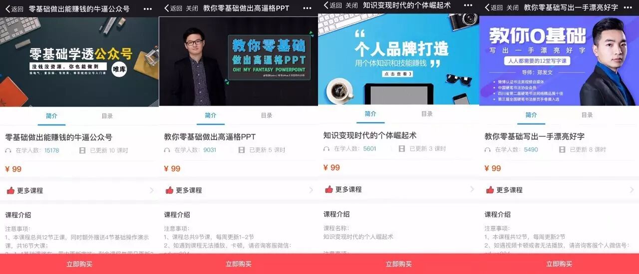 再看小鹅通以外,语音直播分享工具千聊上,开课讲师超过30万人,其中大量来自教育培训行业、情感心理行业。主打年轻人技能学习的唯库,目前共有16个在售课程,绝大部分定价99元,按公开的销售量12.6万计算,总销售额超过1200万元。情感作家陆琪团队自行研发工具,开设算爱研习社,向每个会员收费588元。以每期6个月伴读为特色的静好书院,199元招收学员。就连得到App专栏销售第一的李笑来,也从去年底开始做一块听听,一个类似千聊的语音知识分享工具,上线一个多月时,最高单场课程在线人数就超过6万人。
