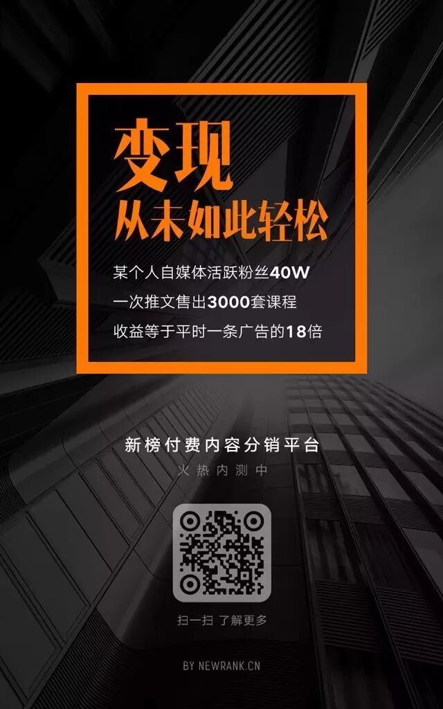 5月3日,新榜付费内容分销平台正式对外公测,并向新榜日常连续监测的超过36万活跃微信公众账号开放分销权限。平台上线初期,将向主动参与分销的自媒体发放千元红包,可通过扫码下方海报二维码提交申请。