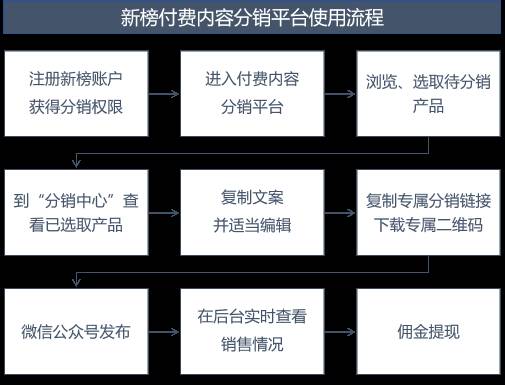 付费内容分销采用CPS(按销量付费)广告交易模式,即自媒体获得分销权限后,通过在新榜付费内容分销平台选取合适的付费内容产品,自媒体可以用微信推文、菜单栏放置、贴片广告插入、微信群转发等形式,传播优质付费内容,并从销售额中获取可观的分成收入。总之,只要你有流量能力,就可以来赚这笔钱。