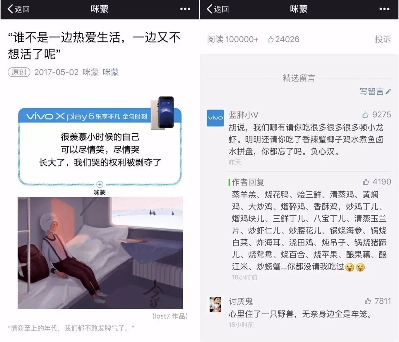 对绝大多数公号来说,任何广告都会对读者和品牌带来一定伤害,只能加以平衡。vivo的金句贴片是不错的方法,对读者的伤害也很小,因为本身咪蒙就是生产鸡汤,加上品牌冠名并没有改变其内容风格。