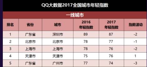 新榜讯 5月4日,QQ大数据发布《2017全国城市年轻指数》报告。报告显示,2017全国一线城市平均年轻指数较去年略有波动,二、三、四、五线城市平均年轻指数与2016年一致。