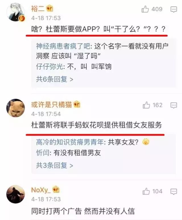 评论区的网友们也明显兴奋了。网友裕二评论说:“啥?杜蕾斯要做APP?叫‘干了么?’???”网友或许是只橘猫则说:“杜蕾斯将联手蚂蚁花呗提供租借女友服务。”