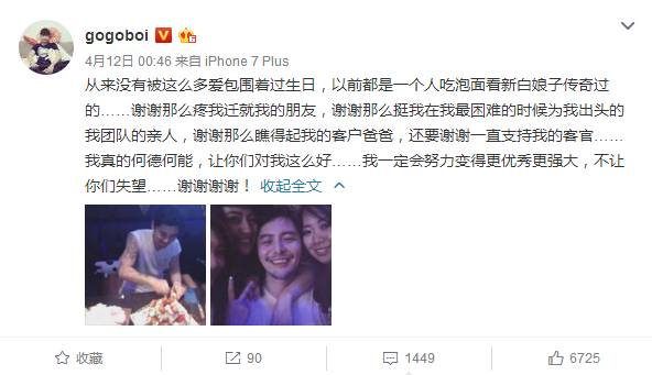 今年4月12日,gogoboi发了条表达感谢的微博“从来没被这么多爱包围着过生日,以前都是一人吃泡面看白娘子传奇度过的。谢谢那么疼我的朋友,谢谢那么挺我的团队,谢谢那么瞧得起我的客户爸爸,谢谢支持我的客官。”