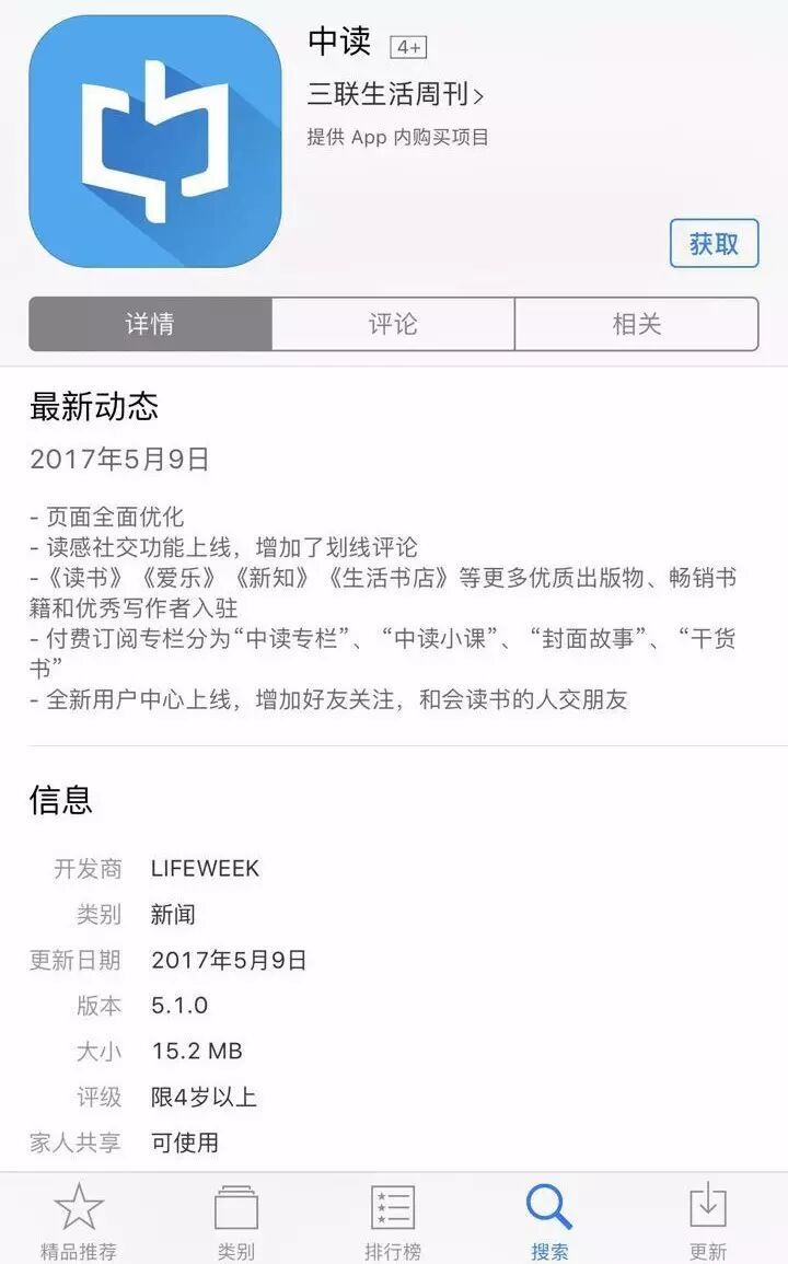 新榜讯 最近,不少运营者向榜妹反馈,《三联生活周刊》的知识付费App“中读”在App Store和安卓市场上线。其中付费订阅专栏分为“中读专栏”“中读小学”“封面故事”“干货书”。目前,用户如若想订阅栏目,需要通过购买“读币”来进行充值,而不能直接通过第三方支付渠道购买。