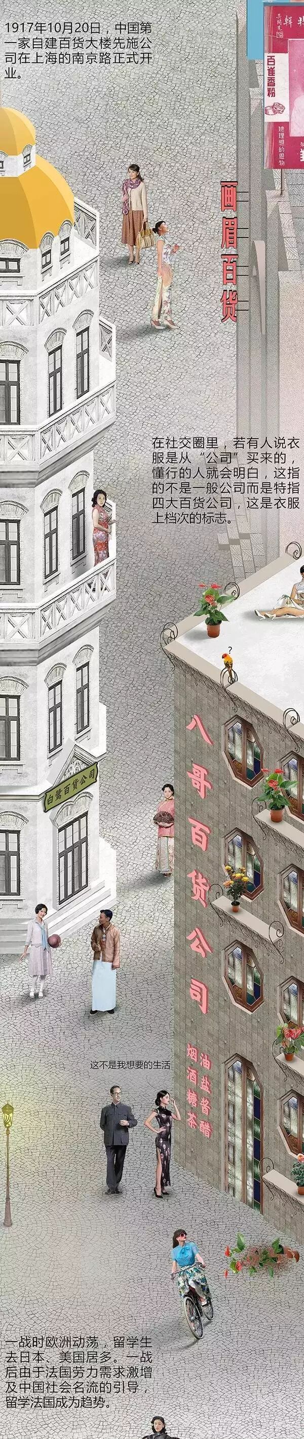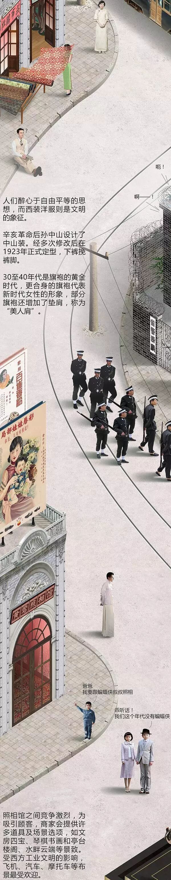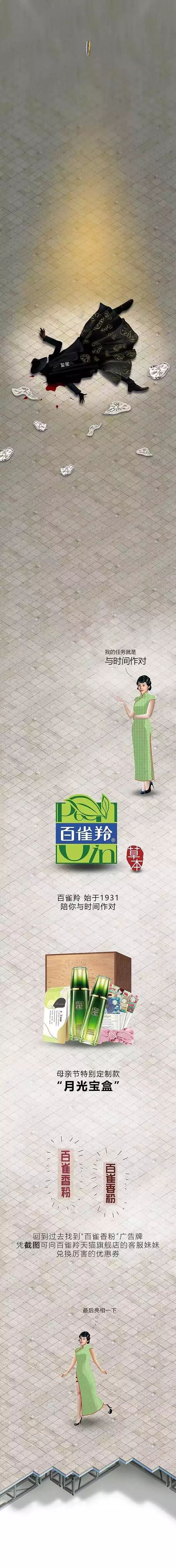 局部气候:我们给客户做推广的主题是“与时间作对”。创意的出发点是因为百雀羚是一个上海的品牌,在1931年成立。从这个点出发,我们做了个民国风格的长图。时间设定在大概1920到1930到1940年代,呈现出民国风情的感觉。其中会涉及到大量民国的生活方式,这是创意的一个大背景。
