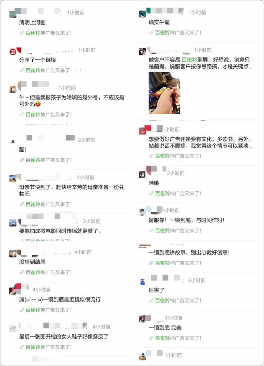 就在一夜之间,百雀羚的一组一镜到底的神广告刷遍了朋友圈。“牛逼、好创意、走心、有趣”几乎是大家一致惊呼的点,也有些网友好奇长图中的“外号外号”是故意埋的梗,还是一个小错误?广告花费了多少人力和时间成本?还有人觉得如果能拍成微电影同时传播就更赞了!
