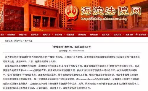 据TechWeb 海淀法院今日披露,因认为对方使用“微博课堂”作为网站名称侵犯了“微博”商标权,且构成不正当竞争,新浪网公司和新浪微博共同将杭州天浪公司和宁波甬浪公司诉至法院,索赔500万。日前,海淀法院受理了此案。