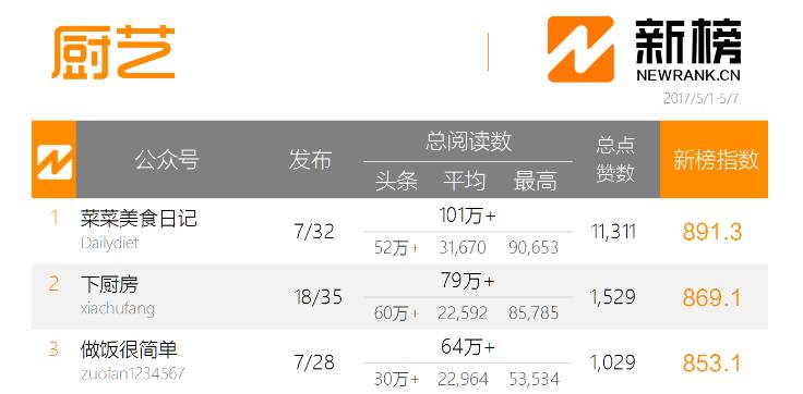 如今,“菜菜美食日记”在新榜发布的中国美食微信影响力排行榜中,基本稳居于厨艺类公号的首位,以及美食周榜前三名。