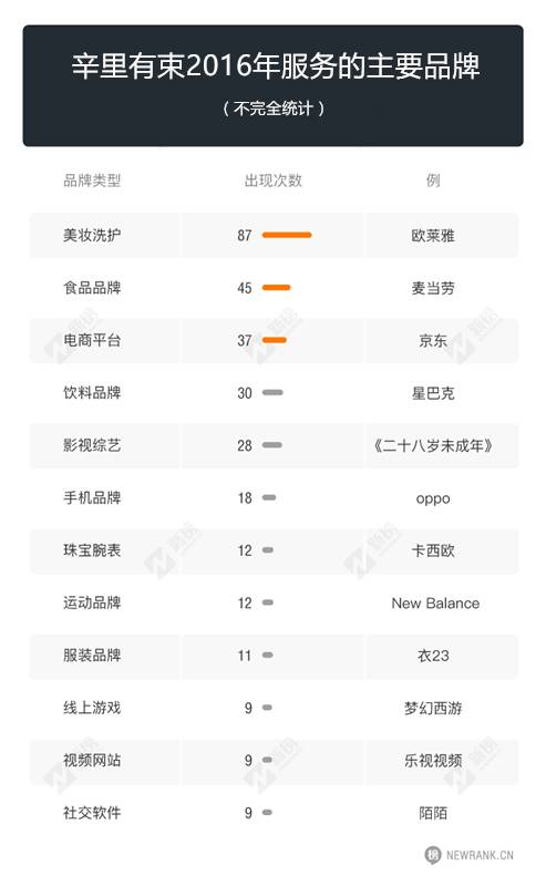 从梳理的图表可以看出,胡辛束的金主爸爸们中,美妆洗护类爸爸是最多的,多达100个左右,其中,欧莱雅、雅诗兰黛、香奈儿、SK-Ⅱ等的复投率都很高;此外,影视综艺、食品、电商平台、饮料等品牌也占很大比例。从涉猎的范围来看,胡辛束是各个品牌通吃,尤其以女性变美和生活类品牌居多。