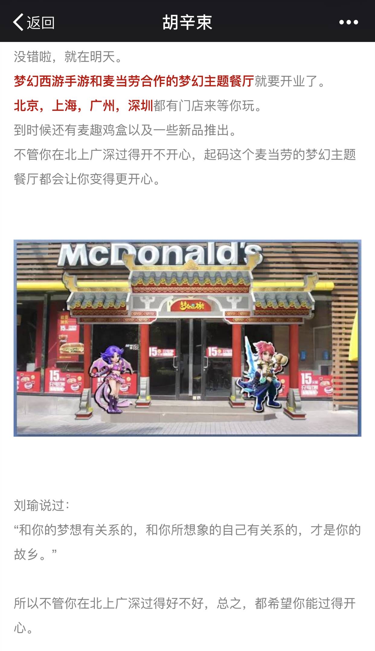 有一次,胡辛束接到梦幻西游和麦当劳的广告,他们希望在北上广深四城分别开一家合作餐厅。“广告如何写才能吸引人呢?”胡辛束把自己的小情绪代入了在大城市生活的年轻人中。