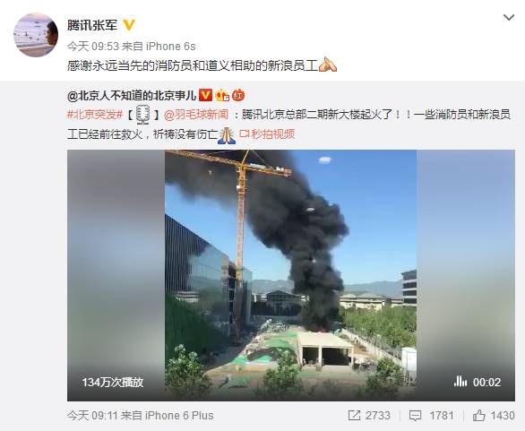 新榜讯 今天上午,微博网友@北京人不知道的北京事儿 发布了一则消息,据消息称,腾讯北京总部二期新大楼起火了,一些消防员和新浪员工已前往救火。随后,微博认证为“腾讯公司公关总监”的@腾讯张军 转发了该消息,并对消防员和腾讯员工表示感谢。