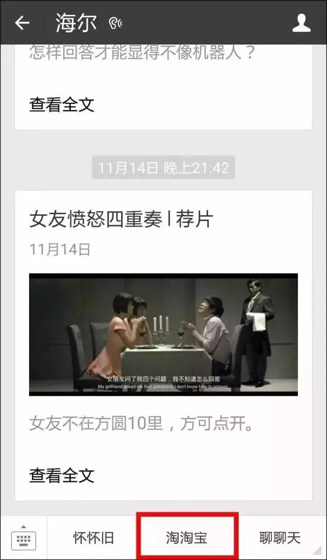 2015年11月,海尔首次在官方公众号上公开出租“海尔”订阅号的一级自定义菜单——淘淘宝。第一个吃螃蟹的广告主是一款叫做“小帅UFO”的电影放映机。