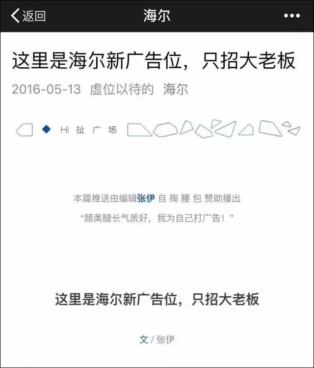 2016年5月13日,海尔官方公众号再次公开招租广告位,这次开放的广告位包含文章顶端的广告语、音频主播张伊FM的开场口播广告和专属的头条软文广告。
