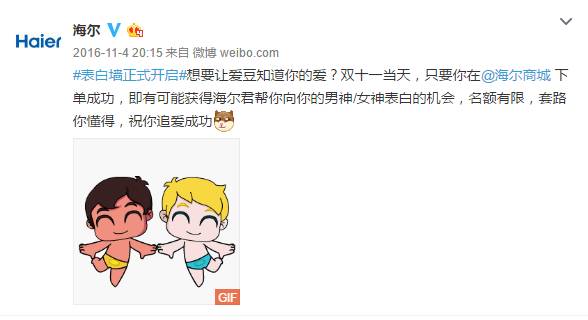 不断跟明星表白也是海尔官微的一个强烈标签。去年双十一,海尔就利用他们的“表白”属性做了一次双十一促销活动。“在海尔商城下单成功,海尔君就帮你向你的男神/女神表白。”