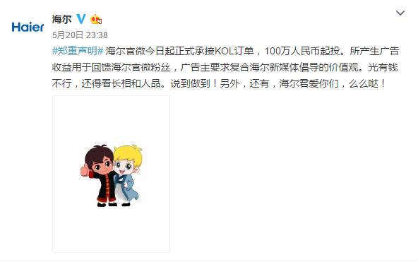 5月20日深夜,海尔在微博上发了一条郑重声明,宣布开始正式承接KOL订单,100万人民币起投。