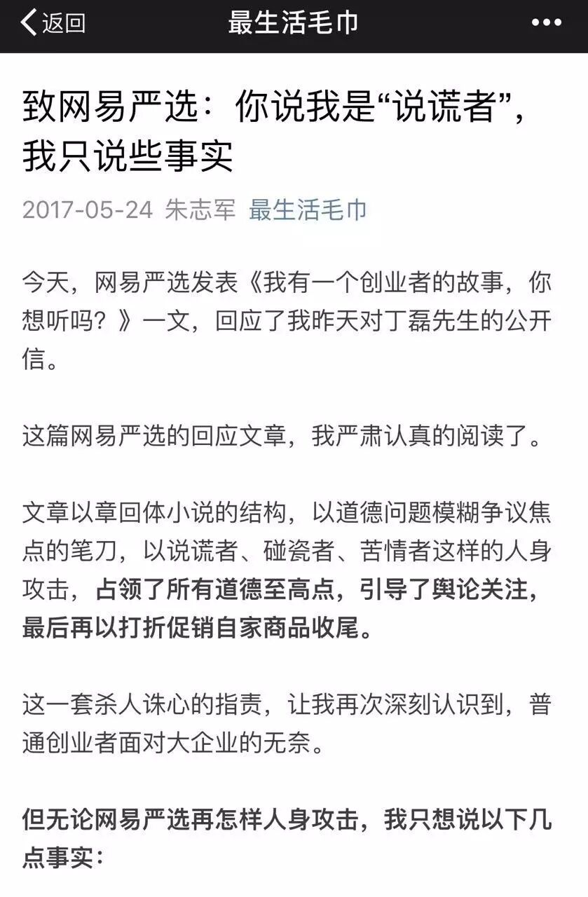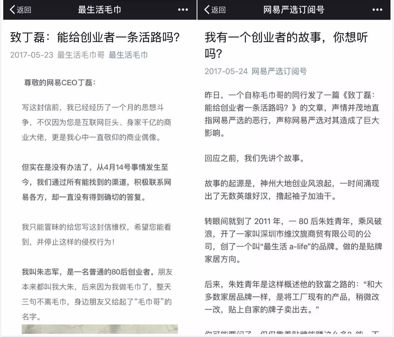 5月23日,一篇题为《致丁磊:能给创业者一条活路吗?》的文章开始在微信朋友圈刷屏,作者是毛巾创业公司“最生活”的创始人朱志军(毛巾哥),首发公号是“最生活毛巾”官方微信公号。文章指控网易严选在广告语“G20专供同款”等方面侵权,呼吁网易严选“别再做扼杀创业者的刽子手了”。