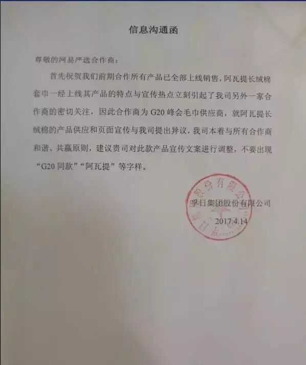 1. 孚日集团在网易严选这款毛巾上架后曾发出沟通函,“建议贵司对此款产品宣传文案进行调整,不要出现‘G20同款’‘阿瓦提’等字样”;