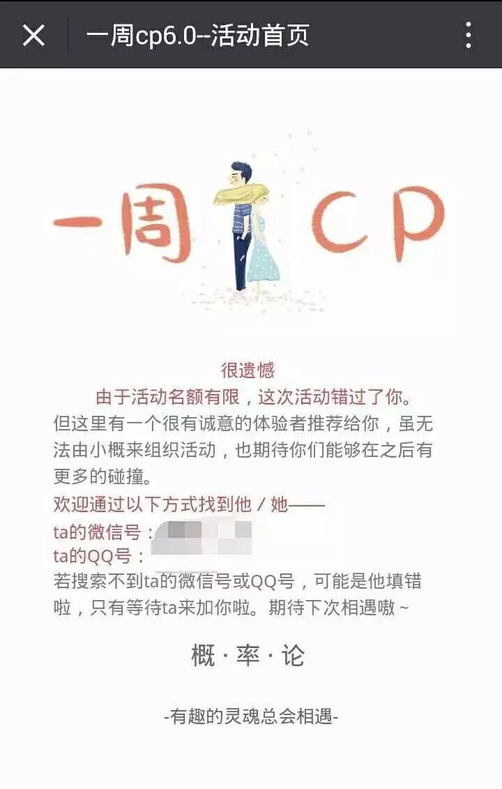 而让“概率论”区别于其它情感类公众号的,是它去年5月20日推出的“一周CP”模式。