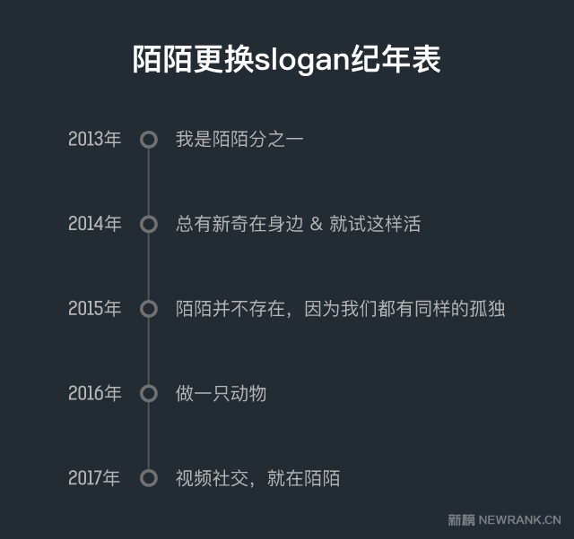 赵圆圆:陌陌改slogan是因为它的主体业务形态发生了比较大的改变。它最早是基于LBS(地理位置)的陌生人社交,但是它在16年前后就推出了红人直播、全民直播。其实它在16年就尝试着开始推视频社交,然后到17年正式地说自己开始做视频社交了。从基于LBS的社交到基于视频的社交,陌陌的LOGO和slogan发生了较大变动。
