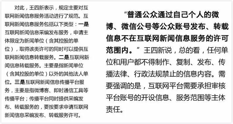【榜妹注:根据即将于6月1日施行的新版《互联网新闻信息服务管理规定》及权威专家解读,新规里的“新闻信息”是指:包括有关政治、经济、军事、外交等社会公共事务的报道、评论,以及有关社会突发事件的报道、评论;关于微信公众号是否需要获得许可才能发布转载新闻,见下图或详见新榜此前推文《“最严新规”+“最严整顿” 自媒体不想封号,就别踩这些红线!》】