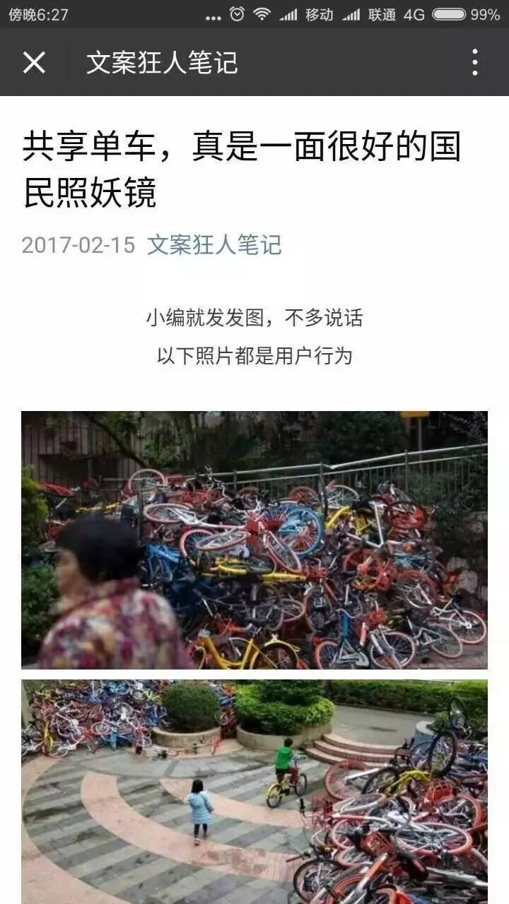 今年2月,一个只有74个粉丝的小号炸出了一篇330万阅读的爆文。爆文名为《共享单车,真是一面很好的国民照妖镜》,整篇文章很简单,呈现了几十张共享单车被损坏的图片,配以少量的文字说明。