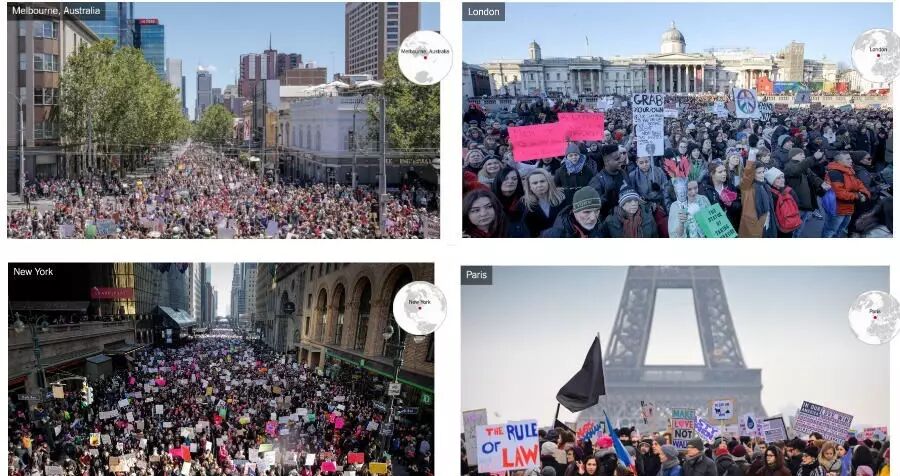 《纽约时报》在华盛顿女权运动中发布一篇图文,向读者展示了发生在世界各地的女权运动,传递“华盛顿绝不是女权运动的唯一爆发地,很多城市都在呐喊”。