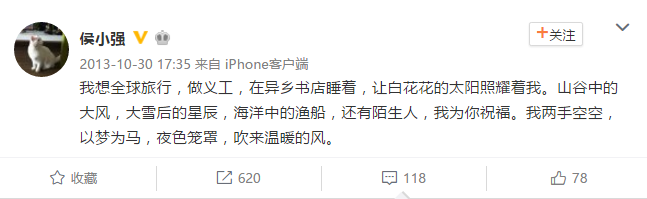 2013年从盛大离职前,侯小强发了一条带有海子遗风的微博,暗示他将退隐江湖。