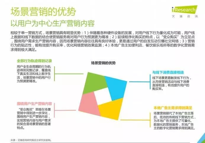 如艾瑞咨询发布的《中国场景营销市场研究报告》显示,当下场景越来越呈现出融合趋势,线上场景与线下场景往往同时出现,而且两者间界限渐渐被打破。相较于单一的营销方式,场景营销的优势也是显而易见的:它既能完整记录用户的行为轨迹,又能围绕用户生产营销内容,并与线下消费直接相连,同时满足了本地广告主的数字化营销需求。