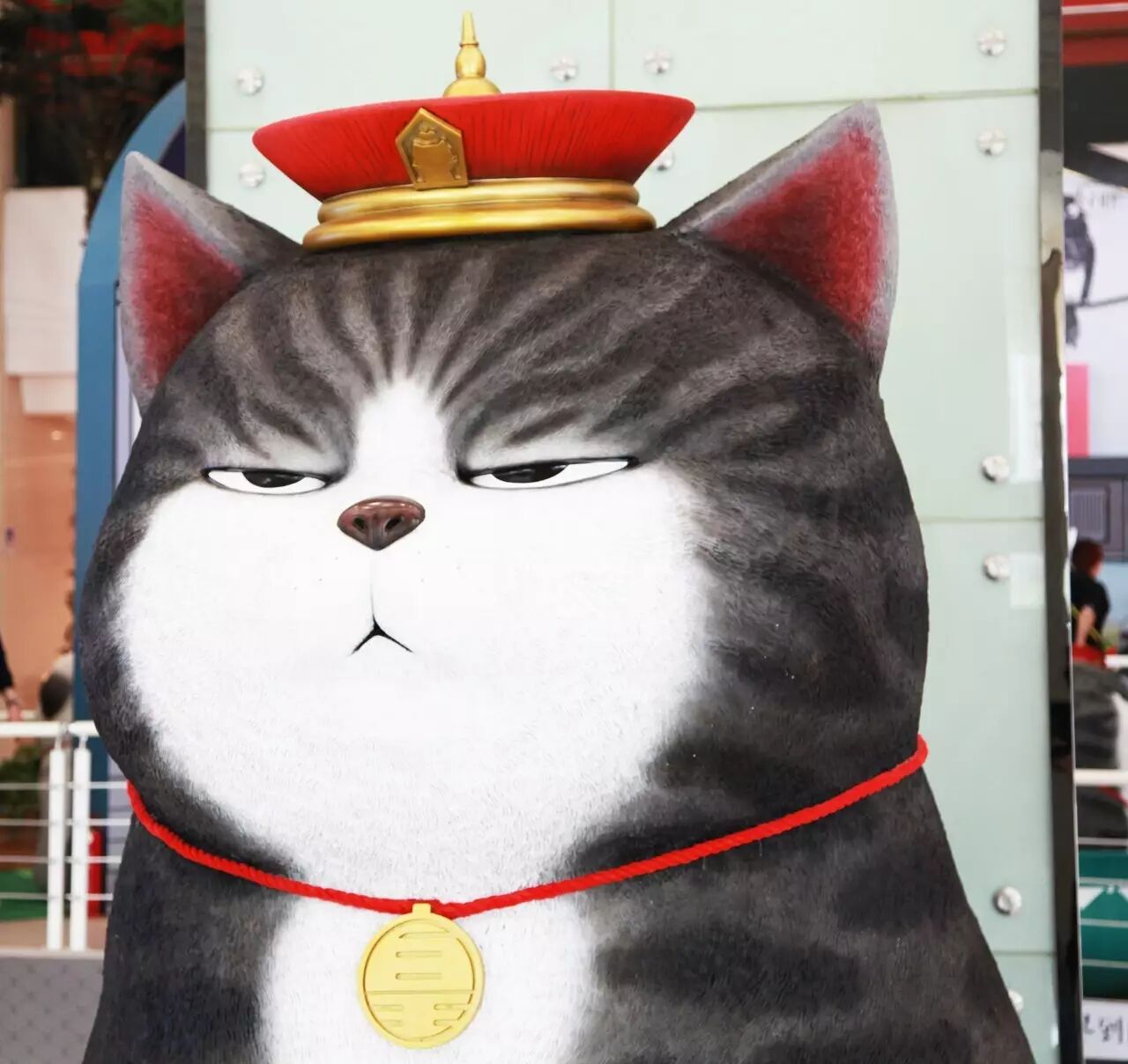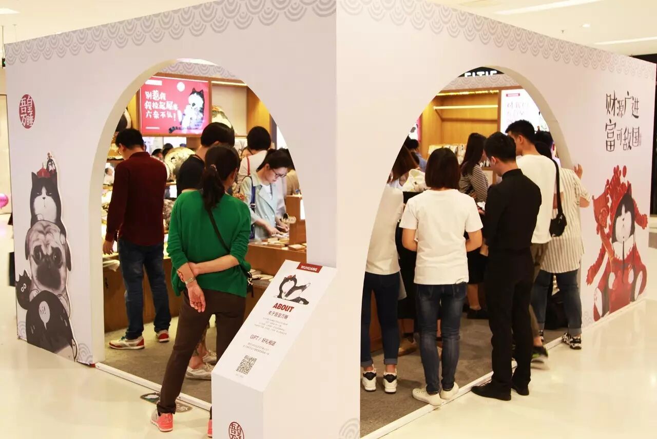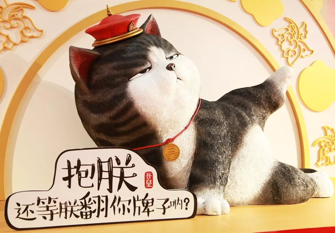 设定好背景场景后,展览首先需要具有强烈的视觉冲击感,以吸引往来的顾客。“我们设立了以吾皇为形象的高达3米的大型玻璃钢。因为吾皇是一个很灵动的形象,当通过固体的静态形象表现出来时,尤其需要抓住它的神韵,把握住傲娇的神态。”