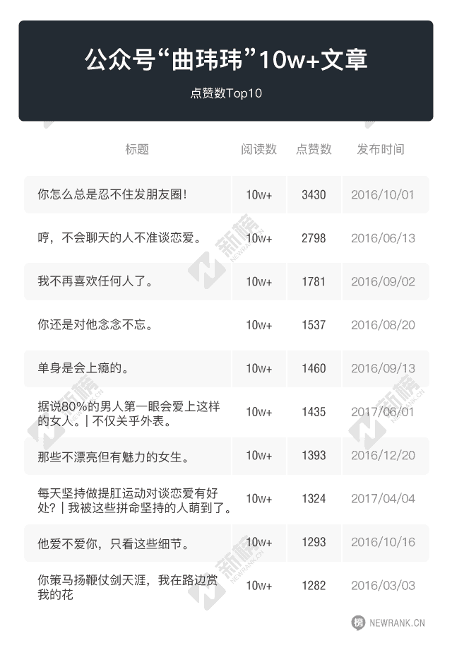 那时候,曲玮玮会在文末留下一句推荐:“真的,我是一个作家,还是你的戳心人”。经过不到两年的努力,这位“戳心人”的粉丝数悄然突破百万,诞生了83篇10w+。