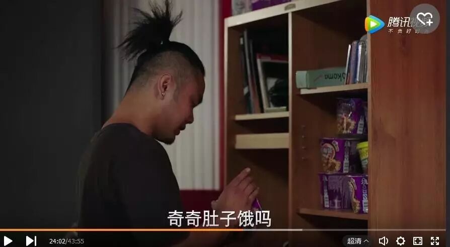 奇奇在沙发上睡着了,辫子男走进来,看到酣睡中的奇奇,立马使命把她摇醒。看着被摇醒一脸懵逼的奇奇,辫子男转而询问:“奇奇肚子饿吗?帮你泡个面吧。”紧接着就迫不及待地走到塞满老坛酸菜牛肉面的柜子前,取出一盒泡面来。镜头也是给出了大大的特写。为了让老坛出镜,设置个如此尬聊的环节也是拼了!