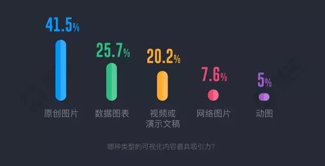有趣的是,即便意识到可视化内容的重要性,也并不代表就真的会有效利用。Venngage 的研究表明,原创图片最多可吸引41.5%的受众,而数据可视化可吸引25.7%。剩下的则为:视频和演示文稿占20.2 %、网络图片占 7.6% ,动图和模型图5.0%。