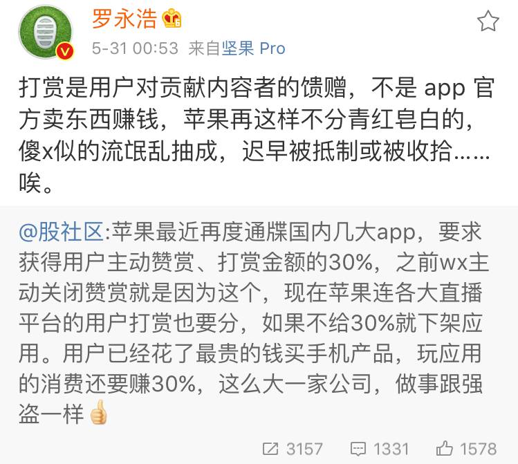 此后,虽然关于“打赏”是否应该被归入IAP(苹果应用内购买)的争论沸沸扬扬,但这样言辞激烈的讨论,在苹果“对所有开发者一视同仁”的最后通牒面前显得苍白无力。