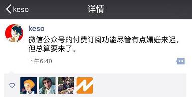 洪波当天在个人微信公众号“keso怎么看”推送了《我为什么现在开始出来卖以及这个公众号还会更新吗?》一文,并把它转发自己朋友圈。随后,腾讯董事会主席兼CEO马化腾跟帖评论称,争取加快推出微信公众号付费订阅。