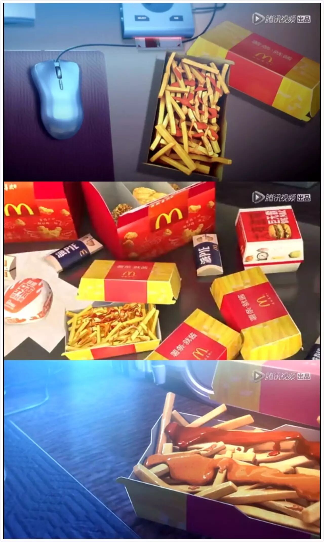 由于剧中叶修是在一家网吧当夜间网管,网吧场景跟麦当劳这样的快餐食品结合,完全不显突兀。于是就能看到各种人物花式吃薯条、吃甜筒的场景啦。