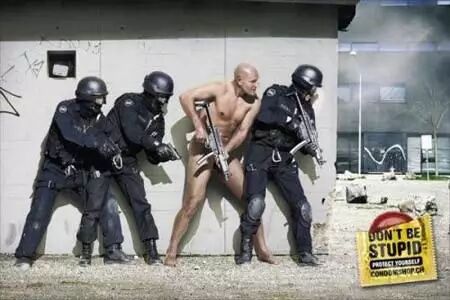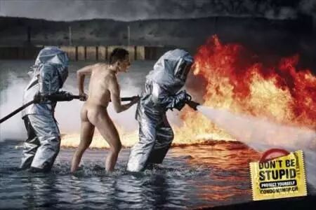避孕套广告:别犯蠢,保护好自己!真人CS和救火的广告场景也是很形象了 23333