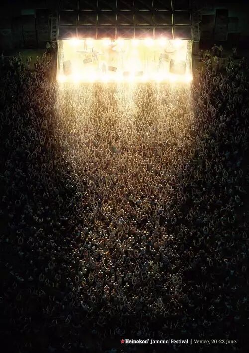 喜力威尼斯音乐节:欢呼的人群蜂拥而至,灯光都打成酒杯的形状。
