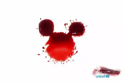 联合国儿童基金会:儿童不该死。用血拼成的米奇头像,警示意味十足。