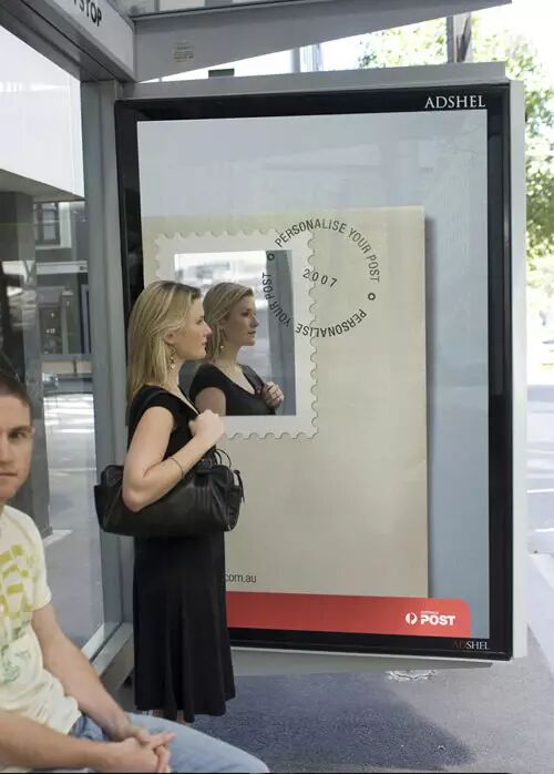 澳大利亚邮政:个性化信件。这则车站旁的广告,直接放上了面镜子,等车的人将直接出现在邮票上,充满惊喜。