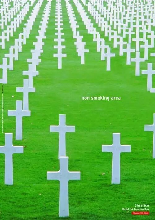 世界无烟日的海报用非吸烟区旁都是十字架的墓碑,来警示人们吸烟有害健康。